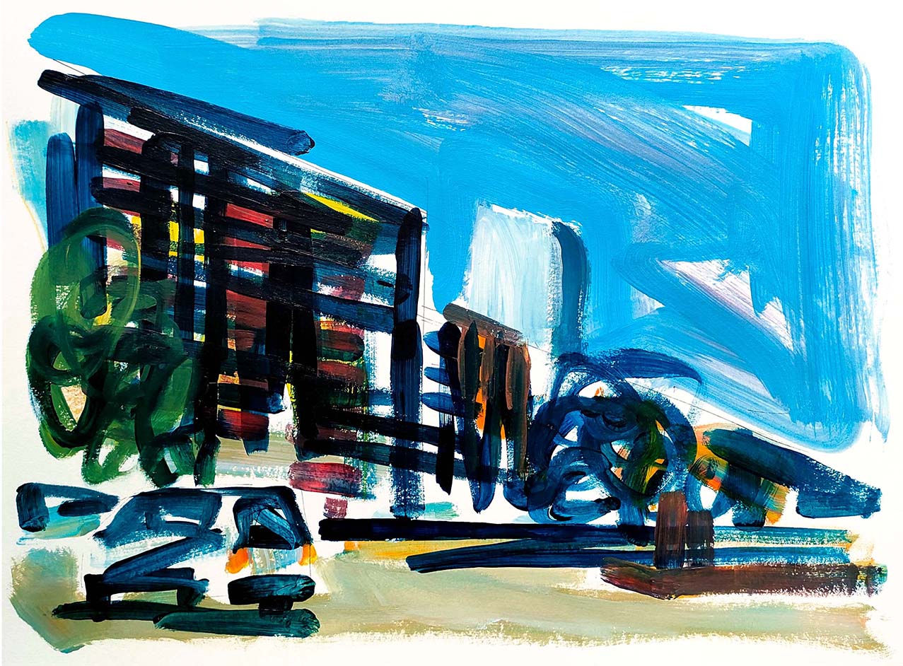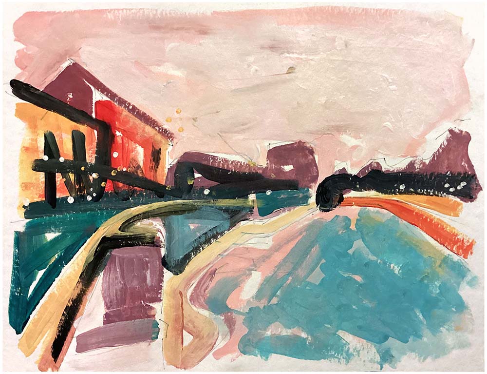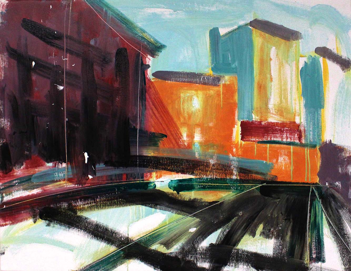 Il contesto urbano con le sue luci, la sua morfologia, le sue forme e i suoi colori sono la piena manifestazione di un pensiero collettivo, di un miscuglio di strati sociali, di abitudini e caratteristiche peculiari costruite e formatesi nel tempo. Basta osservare il proprio quartiere o la propria zona per rendersi conto di quanta particolarità è racchiusa nelle forme che li compongono a partire dall’impianto urbanistico. Apparentemente quelle lingue di asfalto, cemento, blocchi modulari e forme varie non dicono niente, sono solo elementi accostati in modo funzionale; in realtà esse hanno storie da raccontare, celando la carta d’identità propria di un luogo, dei suoi abitanti, dei vari strati sociali e la cultura che vi alberga. La mia ricerca parte proprio dall’osservazione dei vari scorci di città, periferie o campagne, per cercare di creare un dialogo tra gli elementi del paesaggio attraverso le impressioni e la sensibilità personali. La superficie diventa dunque una pagina bianca dove fissare questi dialoghi fatti di linee colorate, macchie e ampie campiture. Per restituire un’impressione quanto più intima e personale del luogo, la stesura del colore deve avvenire in maniera quanto più naturale possibile e diretta, senza ripensamenti. Come un arpeggio di note musicali, le linee e i colori (arbitrari) giocano a rincorrersi, compenetrarsi e a fondersi continuamente, restituendo una nuova visione del paesaggio che diventa cangiante, pulsante, fresco e onirico.