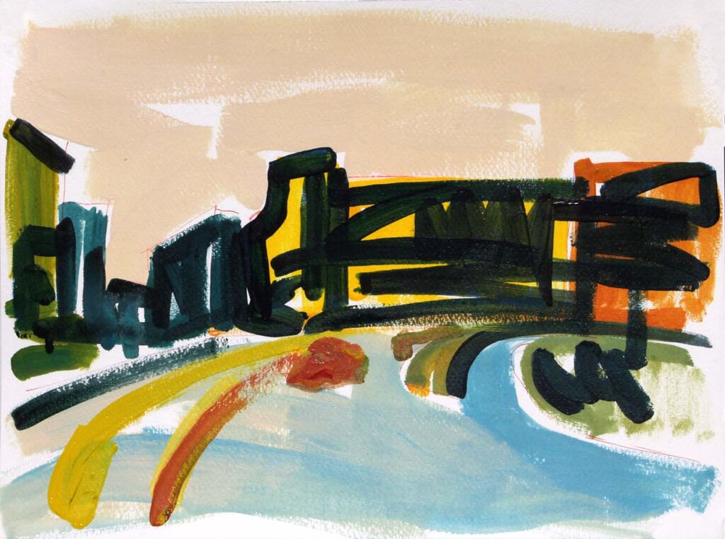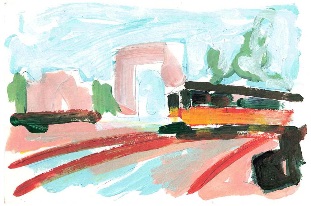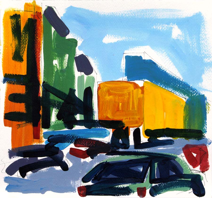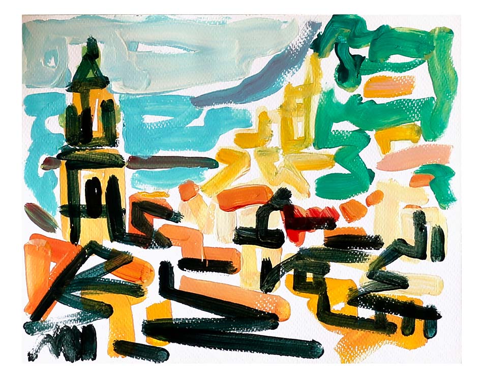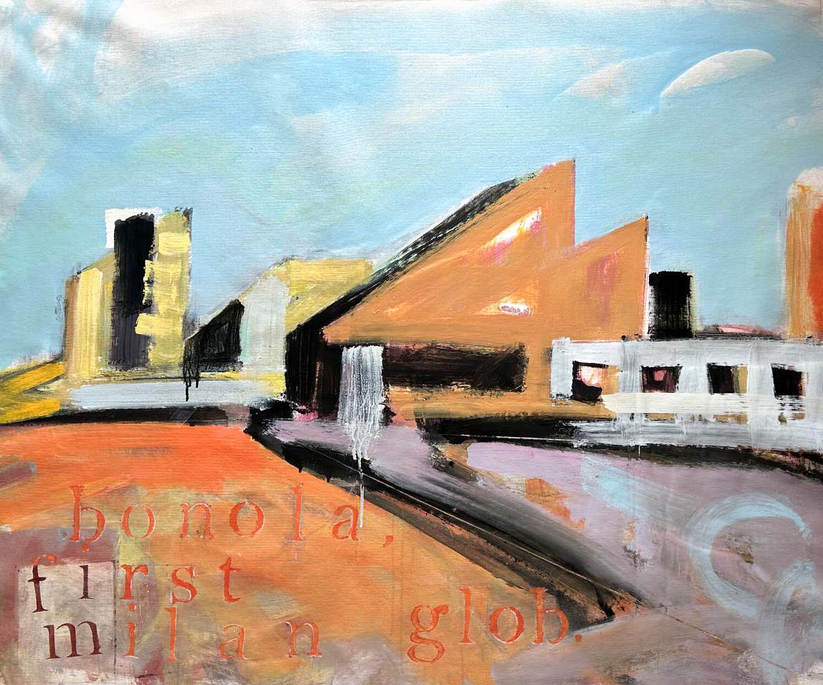 Il contesto urbano con le sue luci, la sua morfologia, le sue forme e i suoi colori sono la piena manifestazione di un pensiero collettivo, di un miscuglio di strati sociali, di abitudini e caratteristiche peculiari costruite e formatesi nel tempo. Basta osservare il proprio quartiere o la propria zona per rendersi conto di quanta particolarità è racchiusa nelle forme che li compongono a partire dall’impianto urbanistico. Apparentemente quelle lingue di asfalto, cemento, blocchi modulari e forme varie non dicono niente, sono solo elementi accostati in modo funzionale; in realtà esse hanno storie da raccontare, celando la carta d’identità propria di un luogo, dei suoi abitanti, dei vari strati sociali e la cultura che vi alberga. La mia ricerca parte proprio dall’osservazione dei vari scorci di città, periferie o campagne, per cercare di creare un dialogo tra gli elementi del paesaggio attraverso le impressioni e la sensibilità personali. La superficie diventa dunque una pagina bianca dove fissare questi dialoghi fatti di linee colorate, macchie e ampie campiture. Per restituire un’impressione quanto più intima e personale del luogo, la stesura del colore deve avvenire in maniera quanto più naturale possibile e diretta, senza ripensamenti. Come un arpeggio di note musicali, le linee e i colori (arbitrari) giocano a rincorrersi, compenetrarsi e a fondersi continuamente, restituendo una nuova visione del paesaggio che diventa cangiante, pulsante, fresco e onirico.
